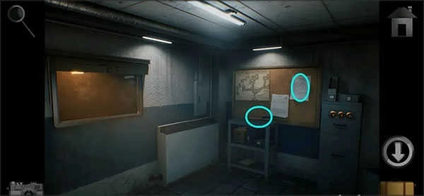 7、到达电梯走廊处,用钥匙打开左侧墙上的蓝色箱子,取得「刀子」后再回控制室。将拉绳安装在百叶窗上拉动,同时观察提示,最后用刀划开油画得到最后一个线索。