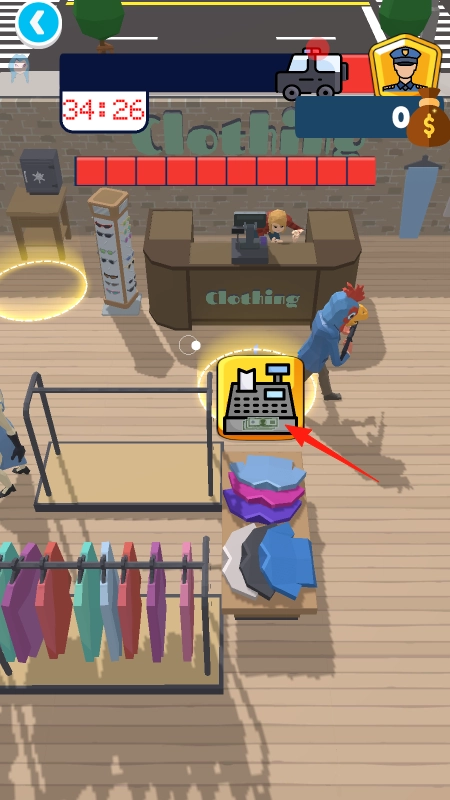 2、店内找到收银机黄色图标,靠近互动,触发抢劫,获取现金,同时留意警察警报红条进度,准备撤离。