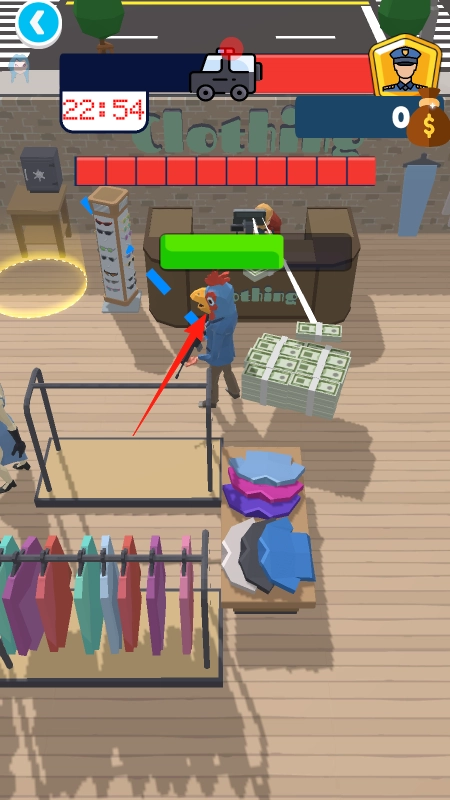 3、得手后,沿箭头原路返回,躲避追捕,将现金带离商店,完成抢劫任务,积累财富,解锁新作案地点武器。