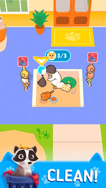 3、留意新出现的宠物如黑猫、花猫,紧跟箭头提示,利用场景设施食盆、互动区满足需求,积累收益升级医院。