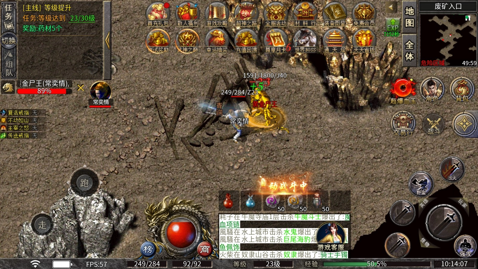 4、第一天如果高级地图挂不住可以去前面地图打红名BOSS每张地图都有可爆大量材料和累充点.打怪就能到终极。