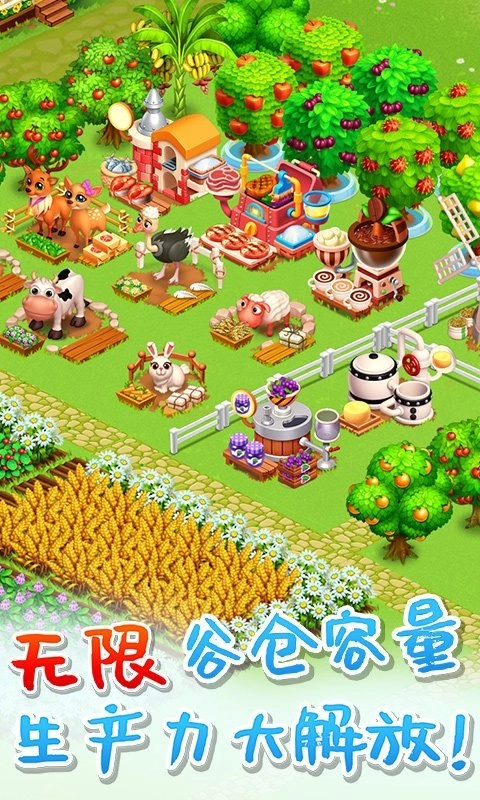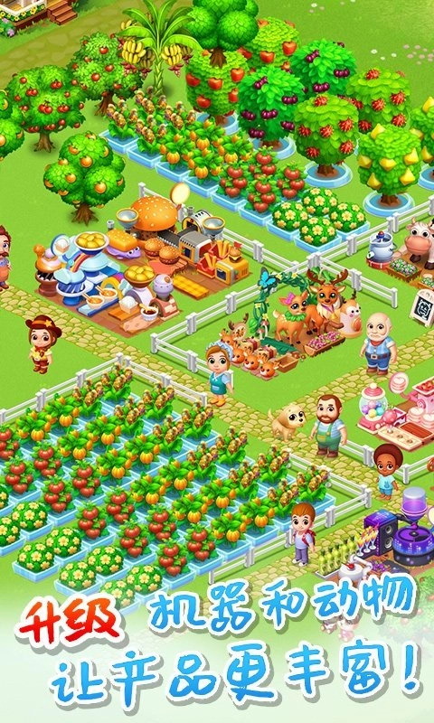1、玩家通过简单的点击和拖动操作种植作物、收获农产品,并喂养农场动物;