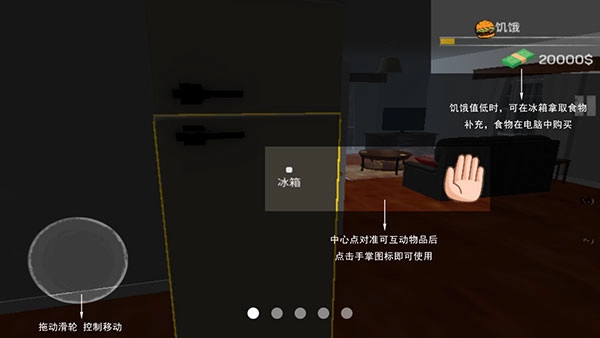 2、拖动滑轮控制移动。饥饿值低时,可在冰箱拿取食物补充,食物在电脑中购买。中心点对准可互动物品后,点击手掌图标即可使用。