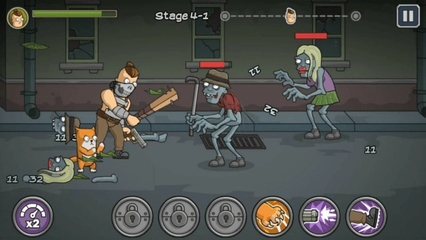 1、经典的横版闯关游戏玩法,玩家可以操纵角色,自由的爽快射杀僵尸。