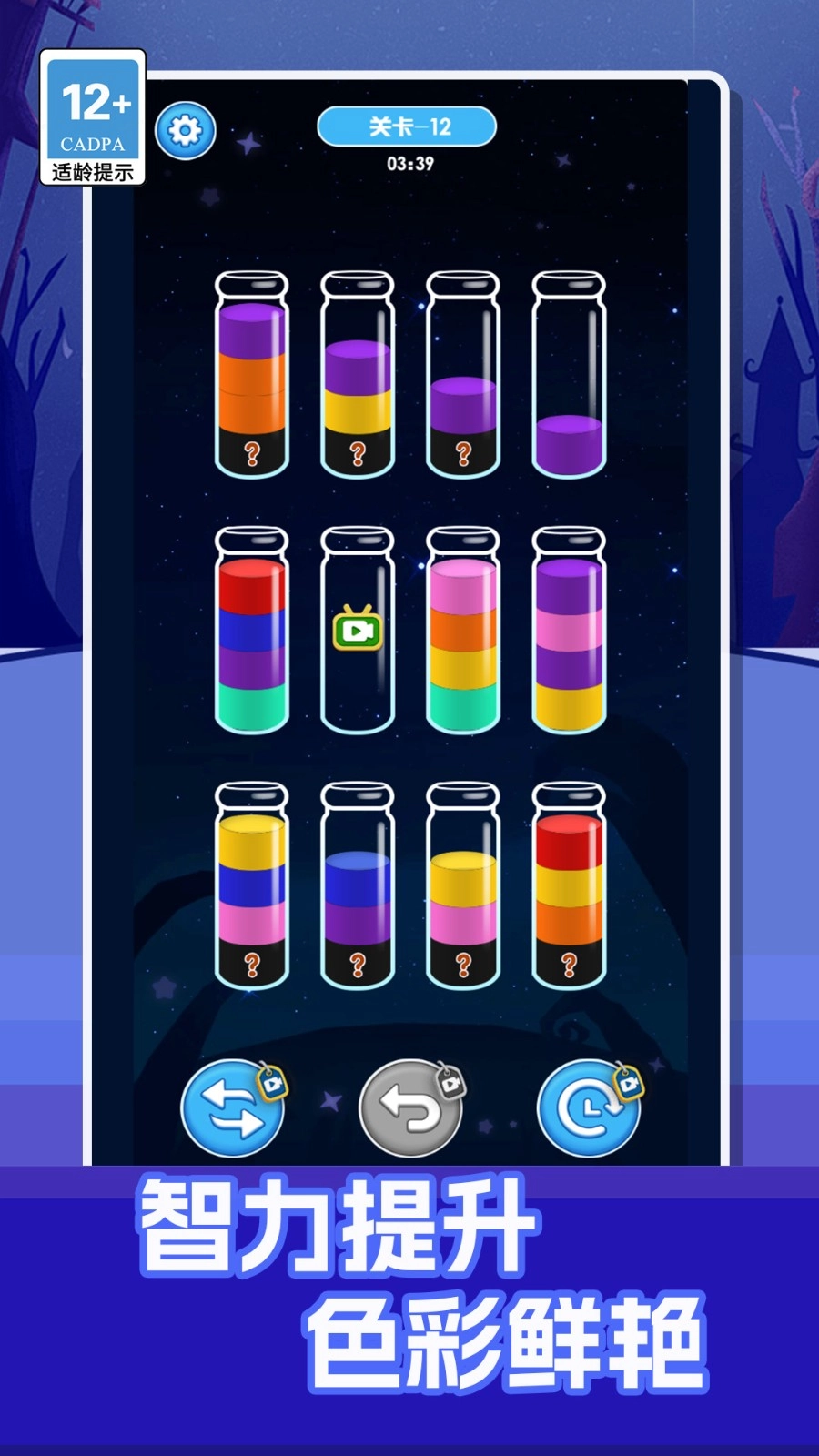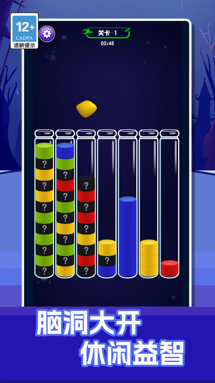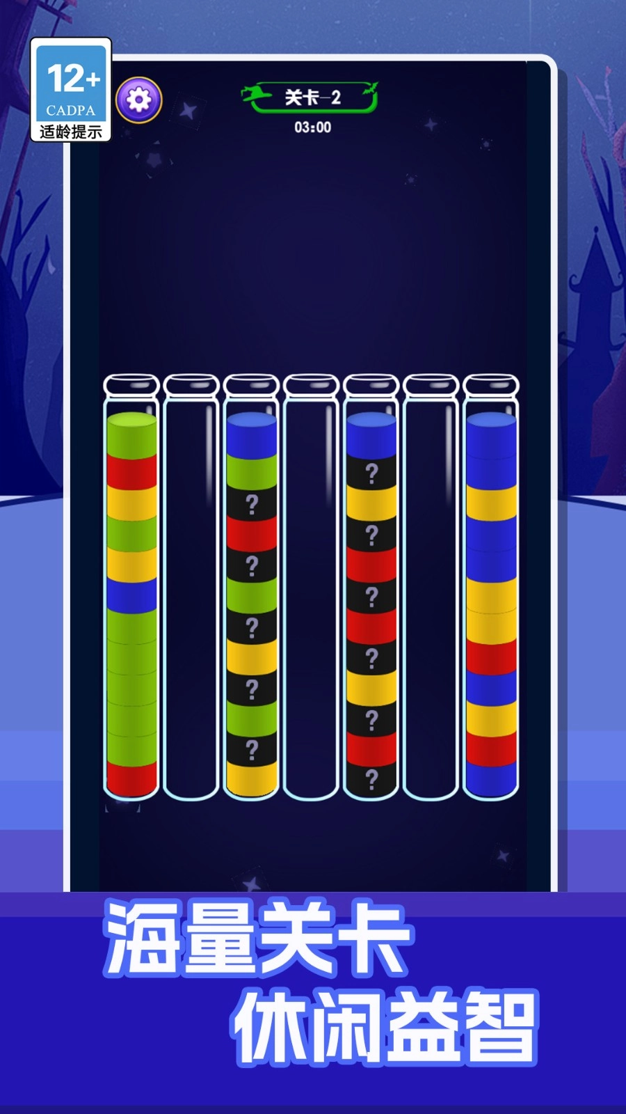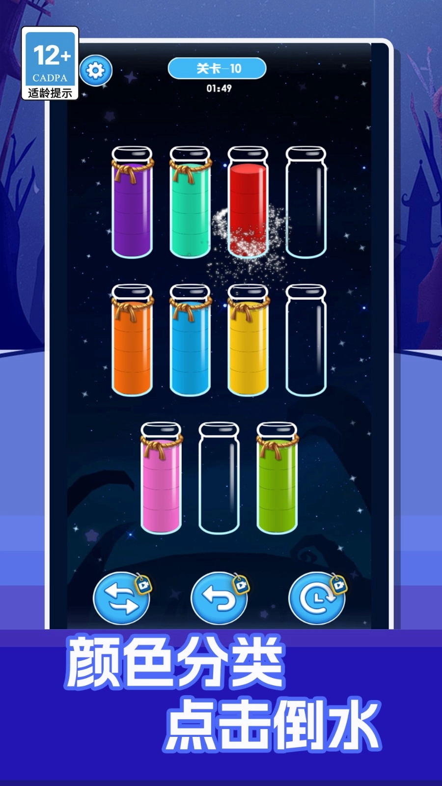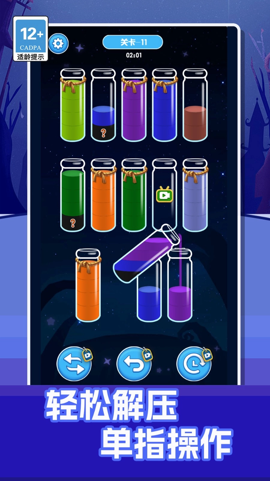 目标明确——每一关要求将所有同色液体归置到同一瓶子内,才算通关。