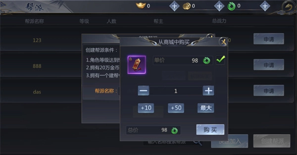 点击创建帮派的提示窗口中的快捷购买按钮,系统会弹出快捷购买页面,直接勾选道具,点击【购买】,即可获得道具【建帮令】。