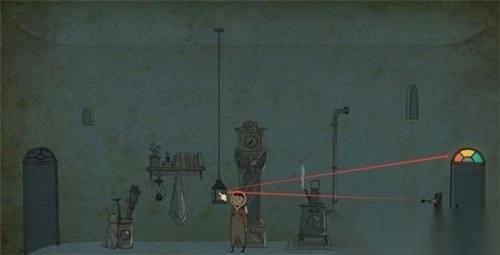 拉动右侧墙体上摇杆使房间内的吊灯下落,熄灭吊灯可获得线索。