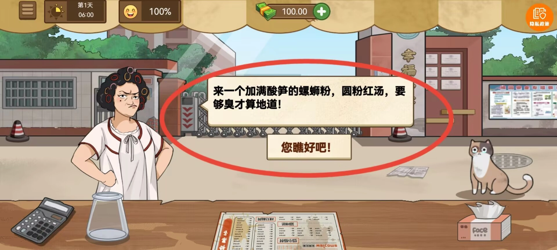 1. 在游戏开始时,玩家能够从煎饼、米粉以及炒菜摊位这几种经营类型中做出选择。选择完成后,便会进入相应场景,此时顾客的需求会通过对话框即时呈现。