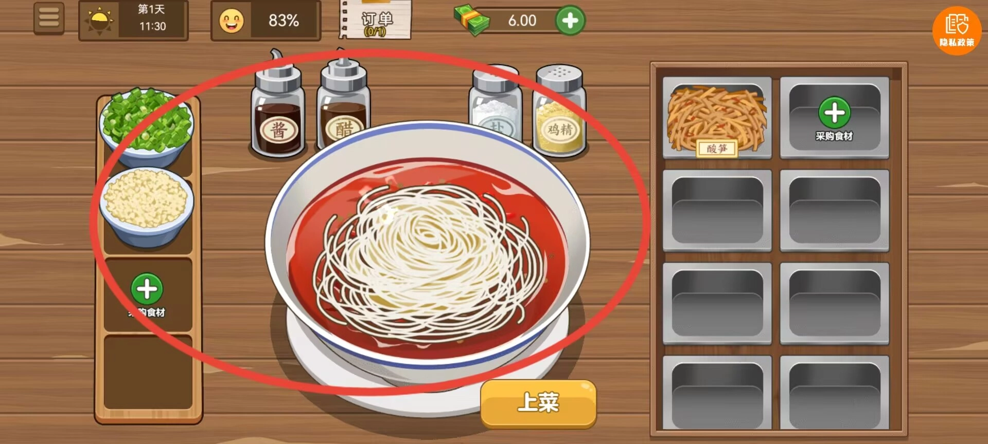 1、基础经营模式,根据客流高峰合理安排备餐,平衡制作速度与食材消耗,最大化每日收益,考验经营策略。