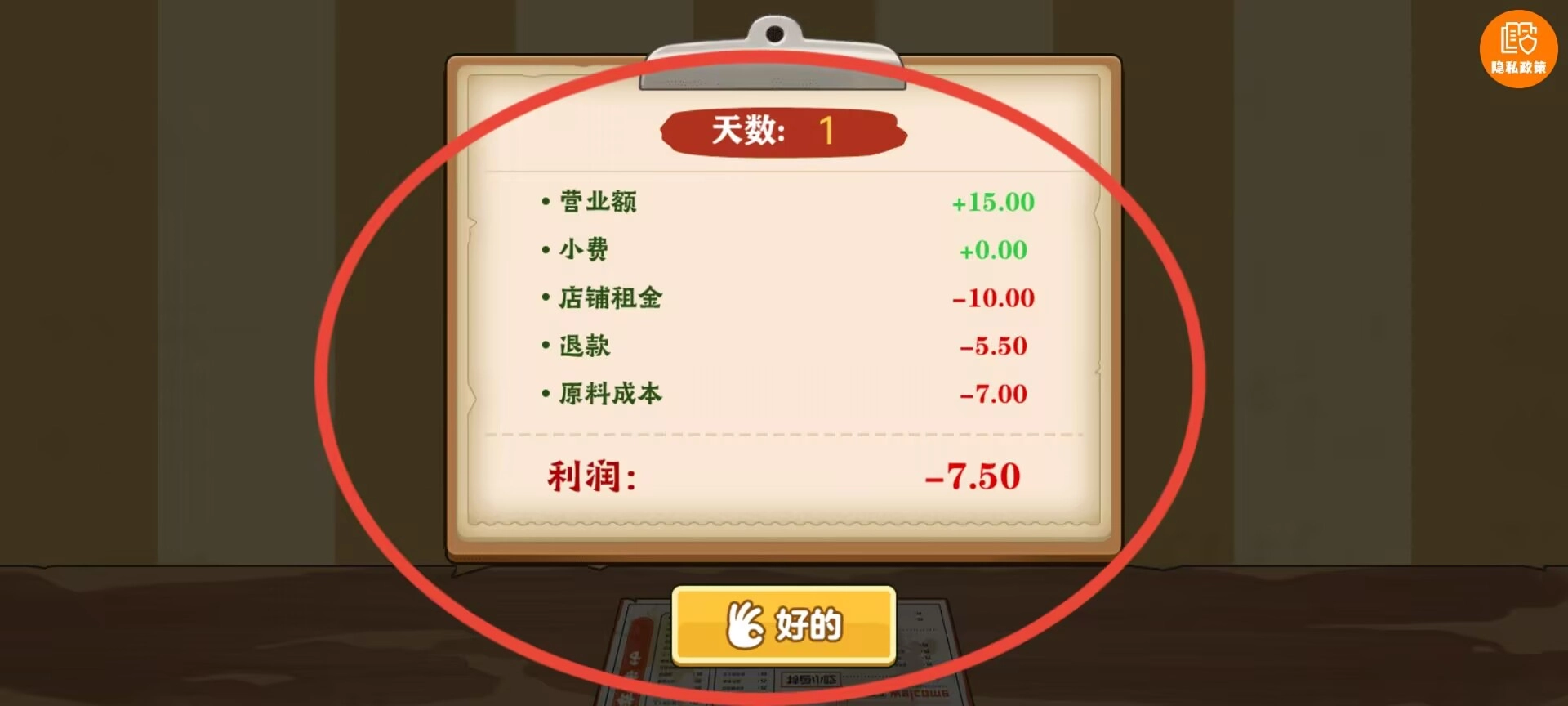 3、界面顶端实时更新营业时间和天气状况,到达规定收摊时间后结算当日收入,扣除必要开支后显示净利润。