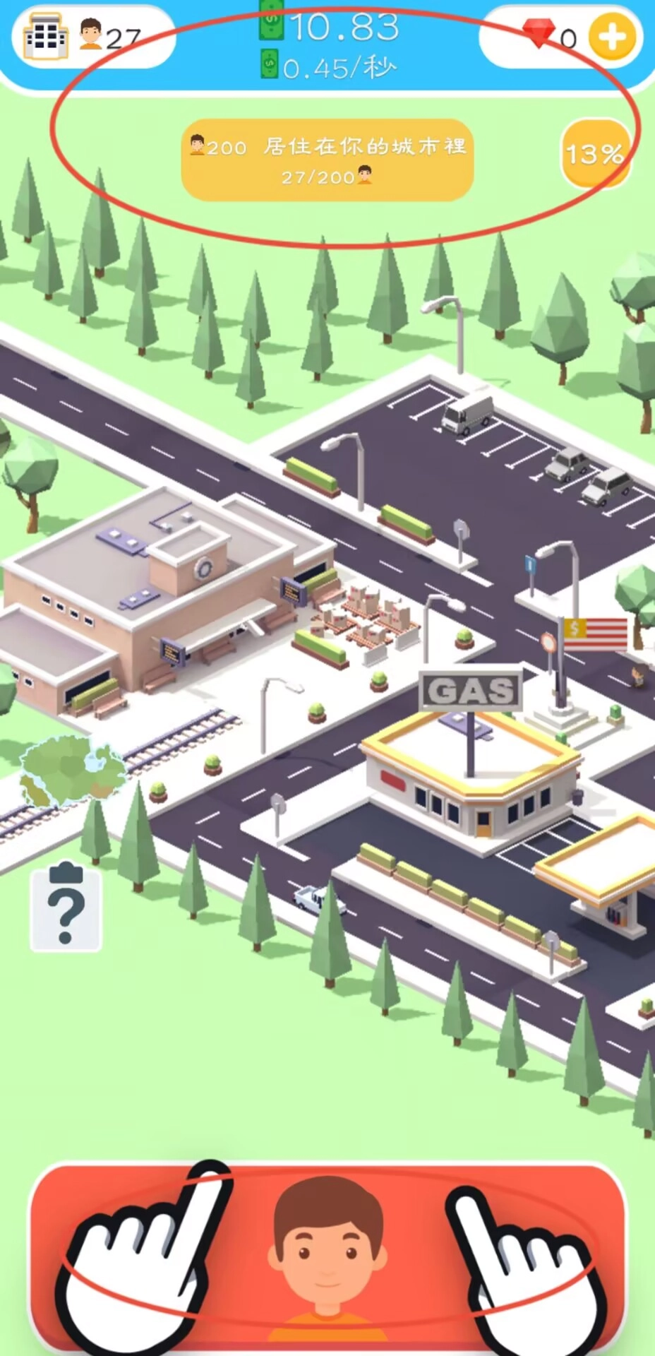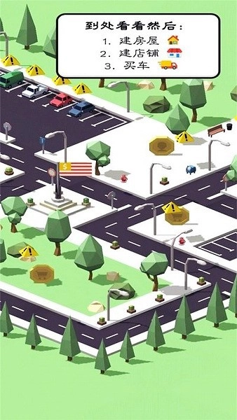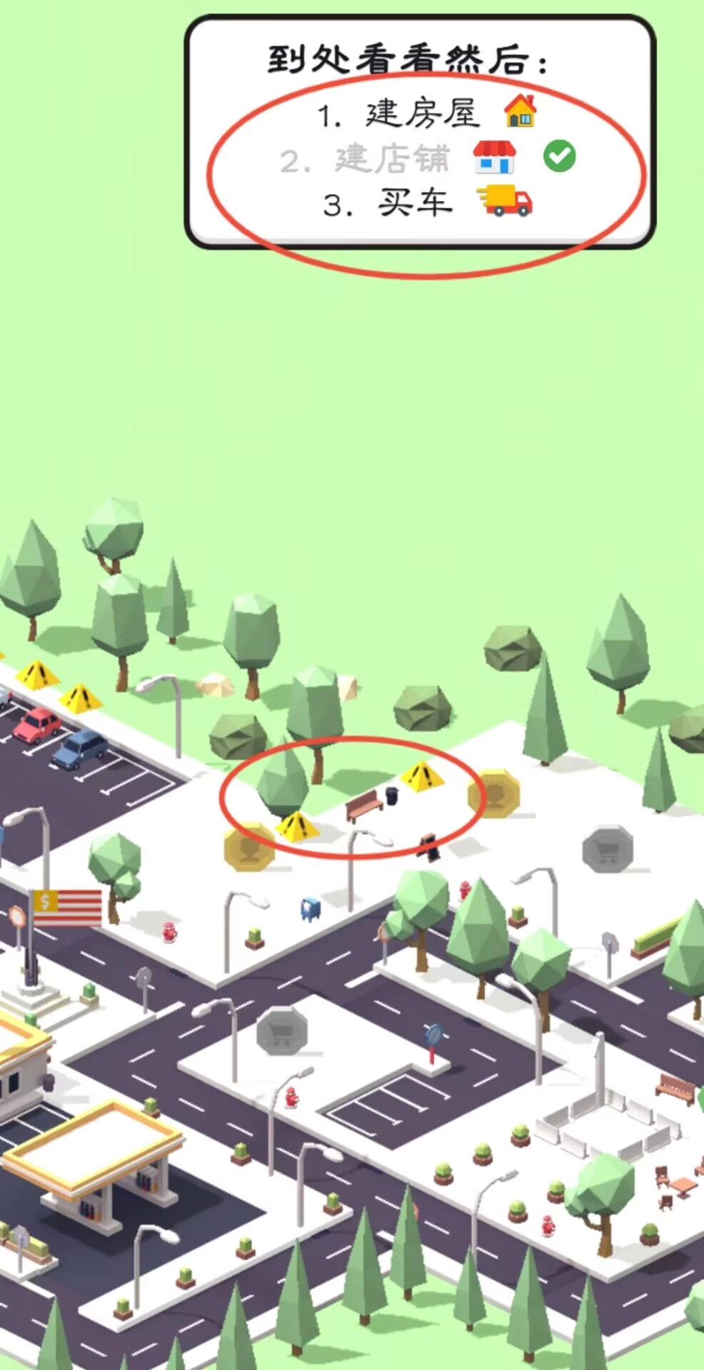 1. 顶部呈现当前建造任务,点击带有四棱锥与叹号标识的空地,便能开启住宅或商铺的建造,当建造任务完成后,会显示勾选标记。