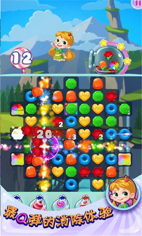 糖果萌萌消的玩法和经典三消类游戏相似,玩家只要交换两个相邻糖果的位置,使3个颜色一样的糖果连成直线,就能实现消除。不同的糖果组合方式会产生各种各样的道具,这些道具可以帮助你消除整行或整列的糖果。