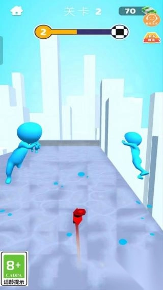 2、实体信息有“关卡1”,画面中能看到蓝色和红色的小人角色,上方有进度条、金币图标,背景是城市建筑风格。