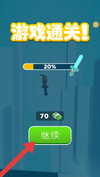 3、实体信息有“游戏通关!”标题,进度条“20%”,金币奖励“70”,以及“继续”按钮,还有武器展示(两把不同样式的武器)。