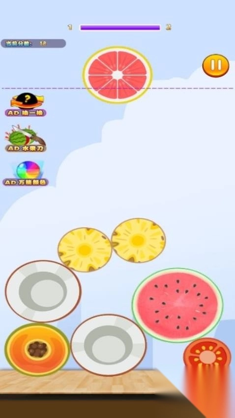 1、拖动屏幕底部的发射器,将水果弹射到场地中,两个相同水果相邻合成升级;
