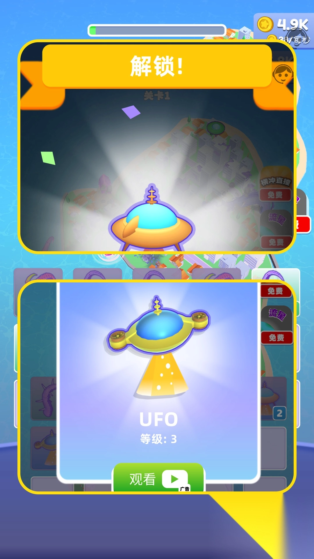 1、通过进程或完成任务,解锁不同等级的UFO、怪物等元素,丰富可使用的道具库。