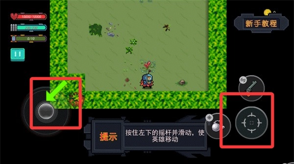 2、开始游戏后通过滑动游戏左下角的摇杆来控制角色进行移动,滑动右下角的攻击按钮来发射子弹。