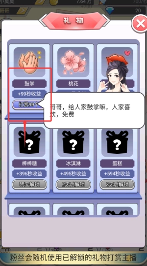 1、创新的互动机制允许玩家以观众身份参与直播,通过打赏礼物影响主播成长路线。不同礼物触发独特特效与反馈。