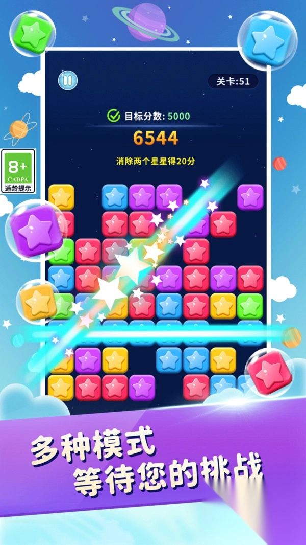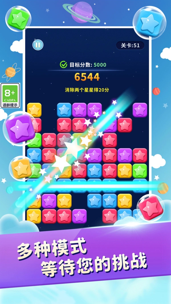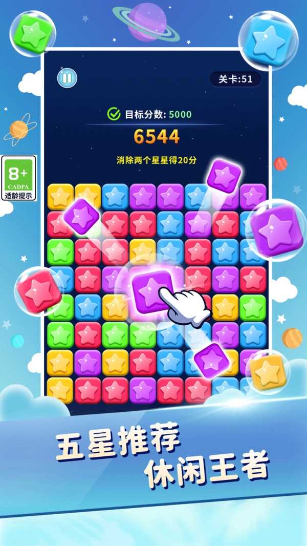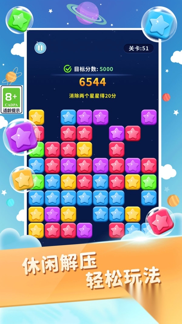 《完美消星星》是一款休闲益智类的消除游戏。在游戏里,玩家会接连遭遇一个又一个颇具难度的关卡。于各关卡中,玩家需不断消除同色星星,以此获取更高分数,进而确保自己能够达成关卡设定的目标。此外,游戏内还设有各类不同的道具,助力玩家更尽情地享受游戏带来的乐趣。