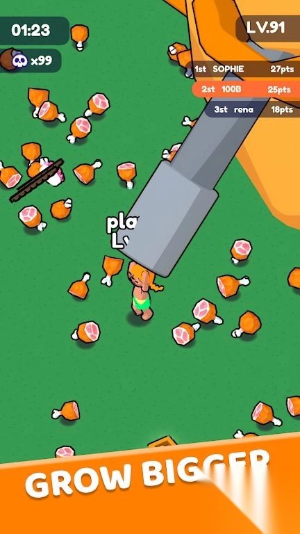 3.场景中随机刷新的肉块可提升玩家等级,而等级越高,角色持有的武器体型会等比放大。