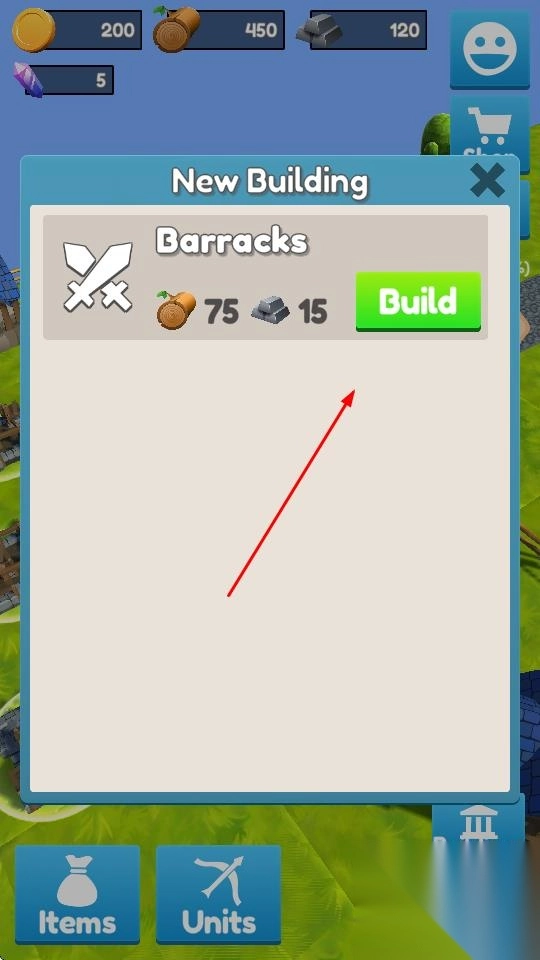 1. 于建筑界面,耗费75木材与15矿石,点击“Build”来建造“Barracks”,以此拓展建筑体系,为出兵事宜做好准备。