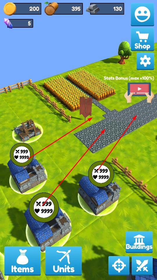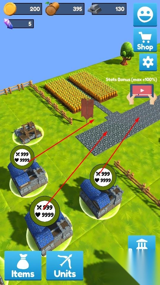 3、在领地场景,规划建筑(如房屋等)布局,利用道路连接,依据“StatsBonus”提示,优化领地建设,提升发展。