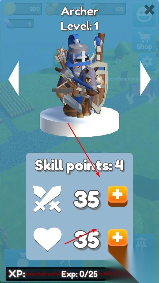 2、进入兵种界面,针对“Archer(Level:1)”,用4点技能点,点击“+”分配到攻击、生命属性,强化战力。