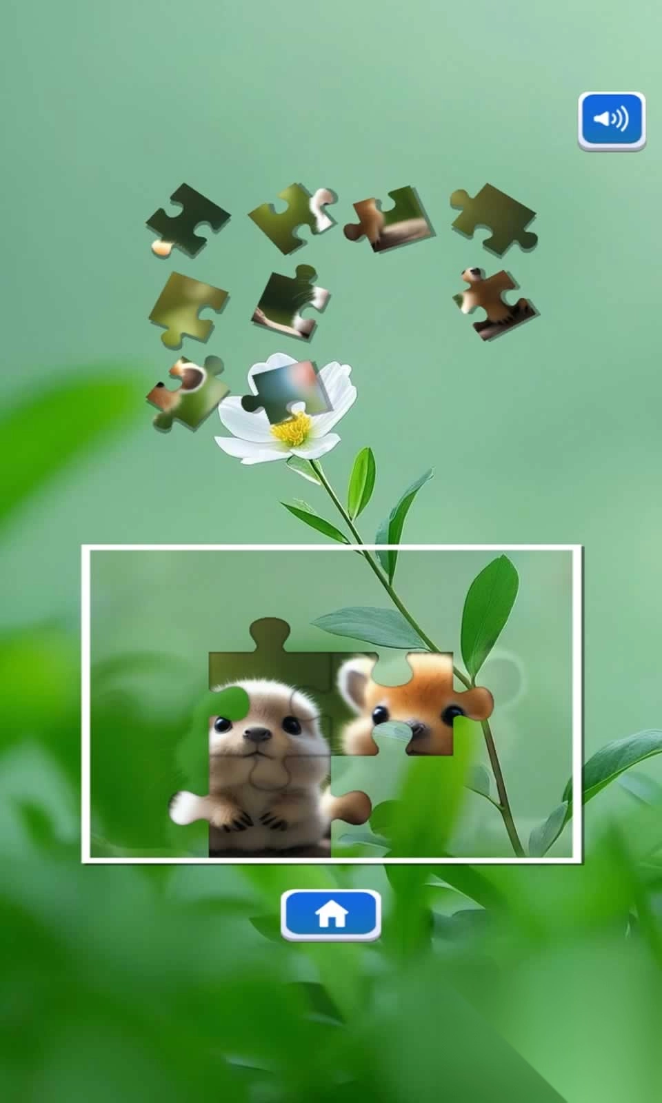 游戏包含多个主题章节,例如森林动物、海洋生物、萌宠乐园等。每个章节内有10至20个关卡,关卡难度逐步递增。初次进入游戏,将从最简单的3x3拼图(总计9片)开始。