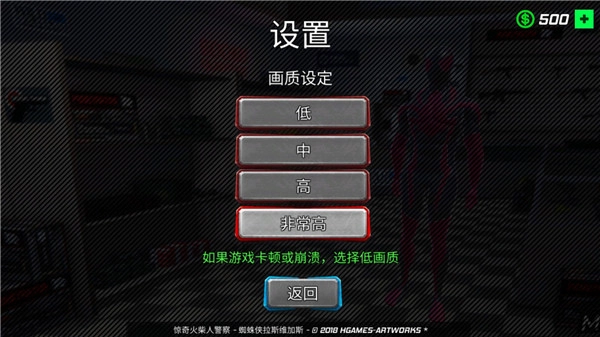 1、进入蜘蛛侠绳索英雄游戏,你可以对游戏的画质进行设定;