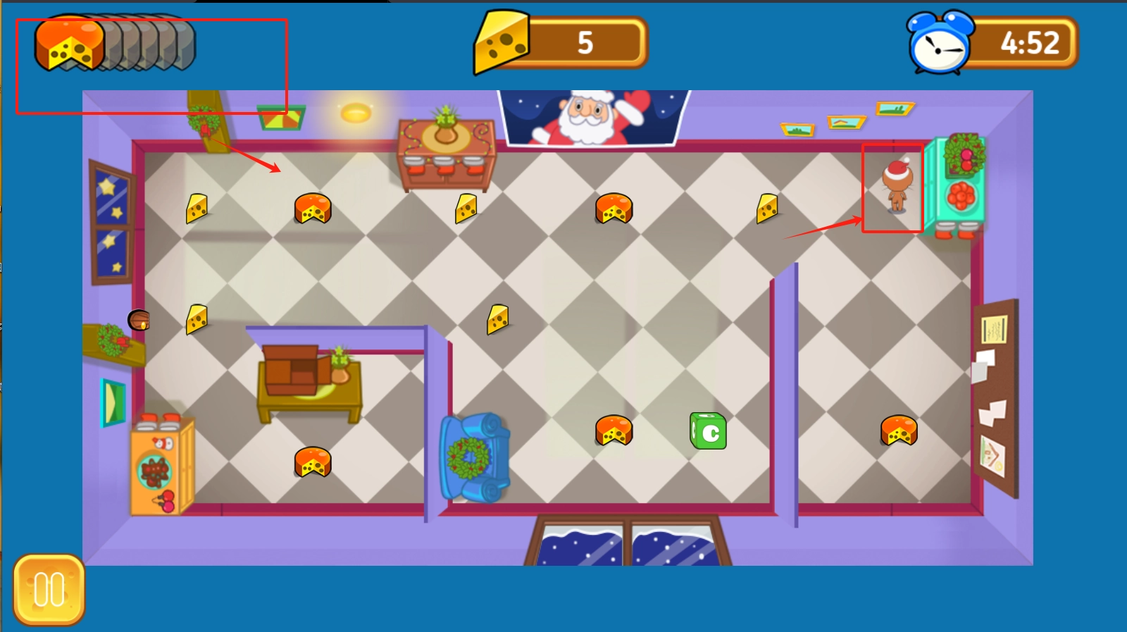 2、时空穿梭机制:在特定位置使用怀表道具可回溯15秒操作,但会随机丢失已收集的奶酪,需权衡风险与收益。