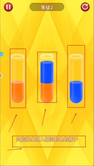 2、玩家只能把相同的颜色的水倒入同一个瓶子里,如果颜色不同的水则不可以倒入相同的瓶子里。