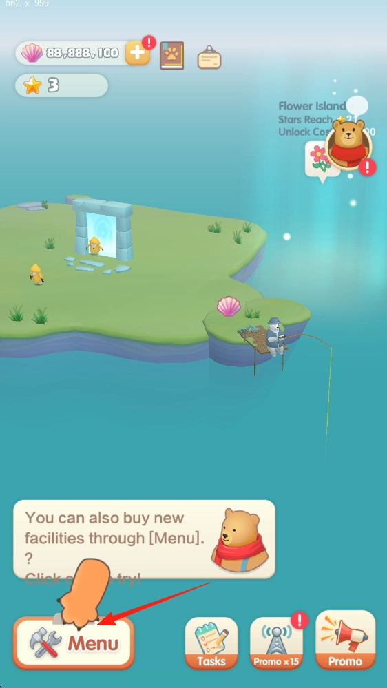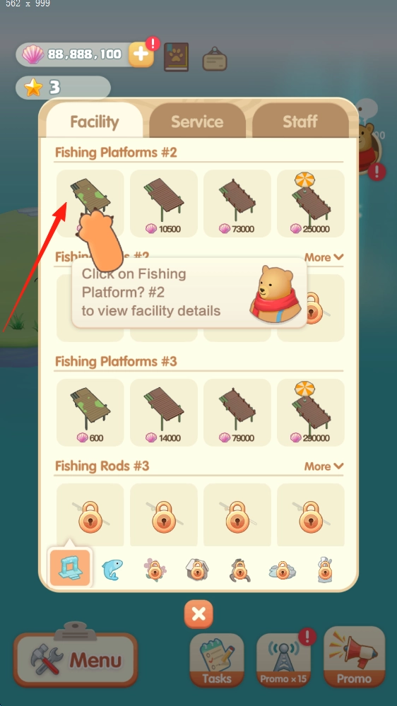 1. 轻点菜单,进入设施页面,选择钓鱼平台,花费贝壳,解锁全新设施。