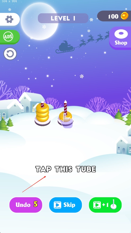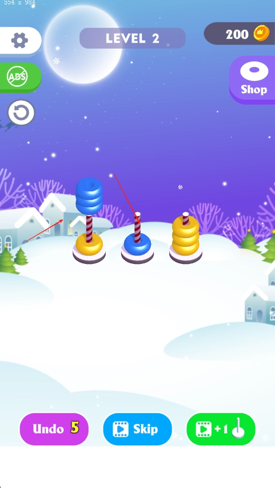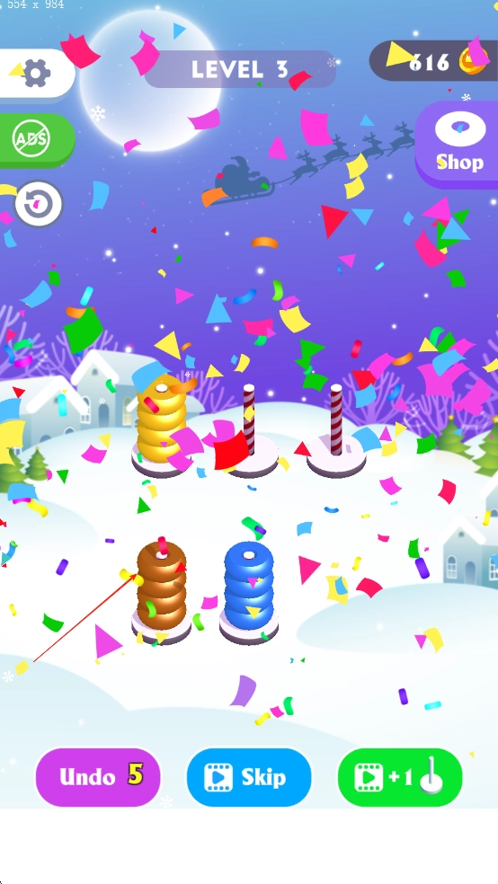 1. 进入关卡后,留意屏幕下方的彩色圆环以及上方的目标色架,通过拖动圆环,使其堆叠到与之颜色对应的架子上。