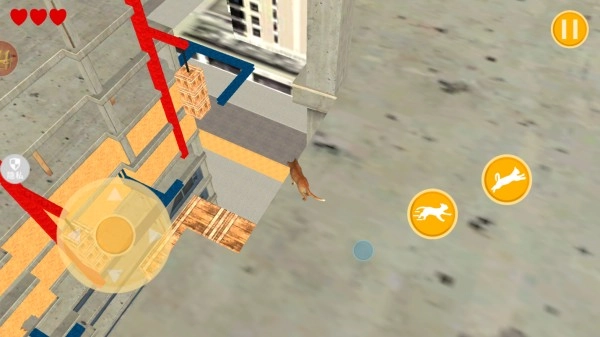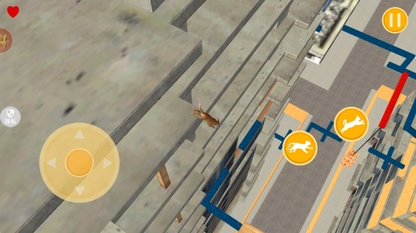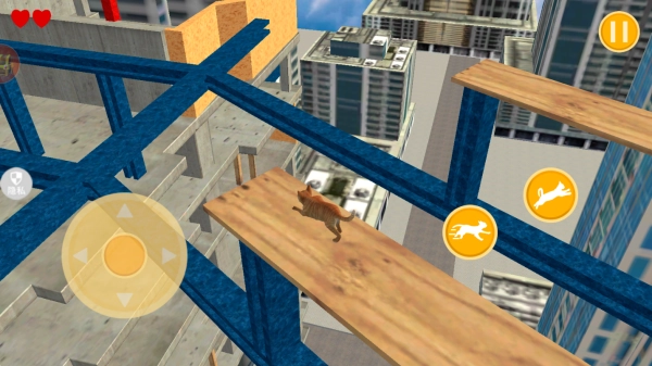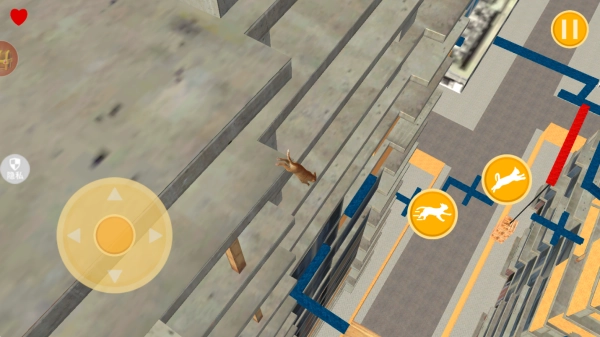 2、找好跳跃的落脚点,再控制小猫不断的向下跳跃,左侧轮盘控制猫咪移动方向,右侧加速跟跳跃按钮。