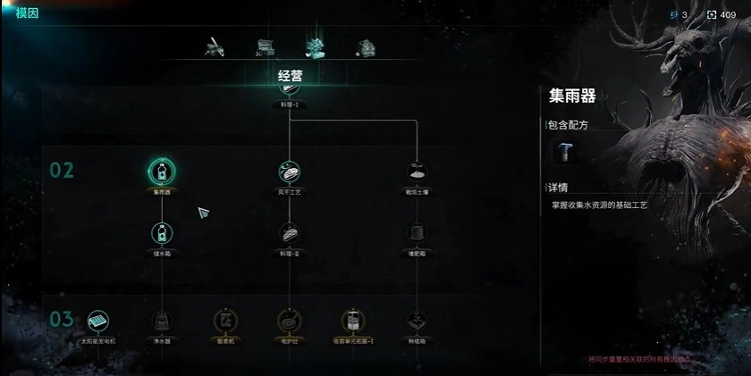 3、经营类:料理系统先开一级,加上风干热工艺就够用了;至于集雨器前期可以跳过,脏水去河里搞,烧开了照样能喝。