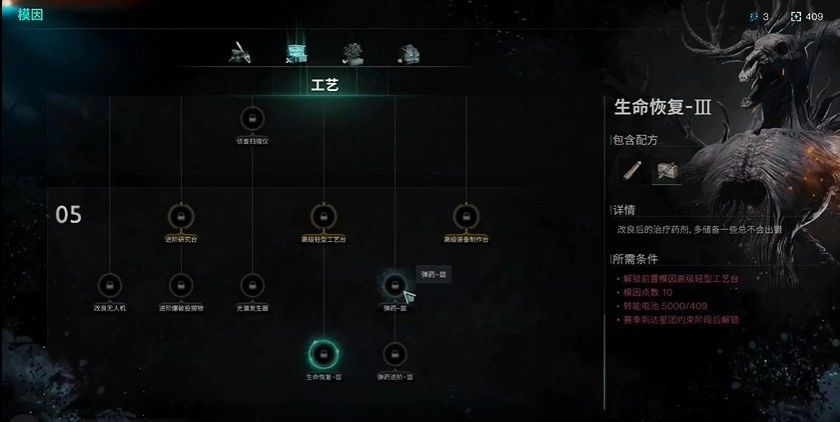 2、工艺类:研究台、工艺台、制作台要点满才能应对复杂制造流程;PVP玩家务必点满改良无人机和光谱发射器;弹药相关得拉满,生命恢复可以视情况选择。