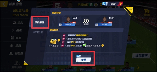 5、最后在球员重置界面中,点击下方免费即可将该球员的等级、能力等重置