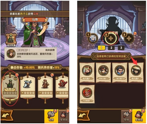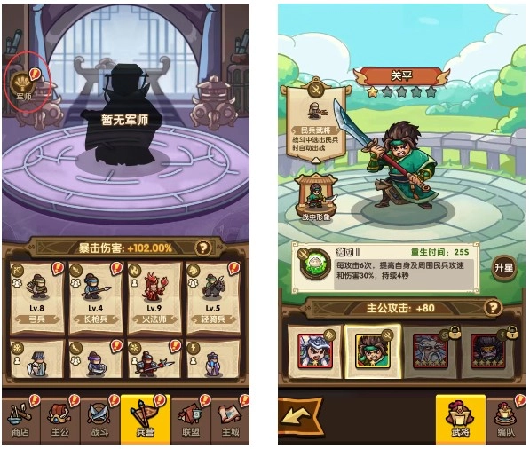 重复获取军师卡牌可用于升星,升级后将提升暴击与对应兵种的伤害加成。和武将系统类似,即使不参与战斗,该类增益也将直接作用于主公,是提高整体战力不可或缺的部分。