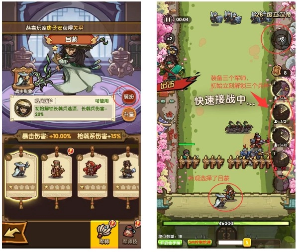 每位军师对应特定兵种,激活后可使主公在战斗中即时招募相应部队。军师本身不具备攻击能力,而是以辅助身份在主公周围提供策略支持。主公还可自定义军师形象,调整外观展示,增加战斗代入感。