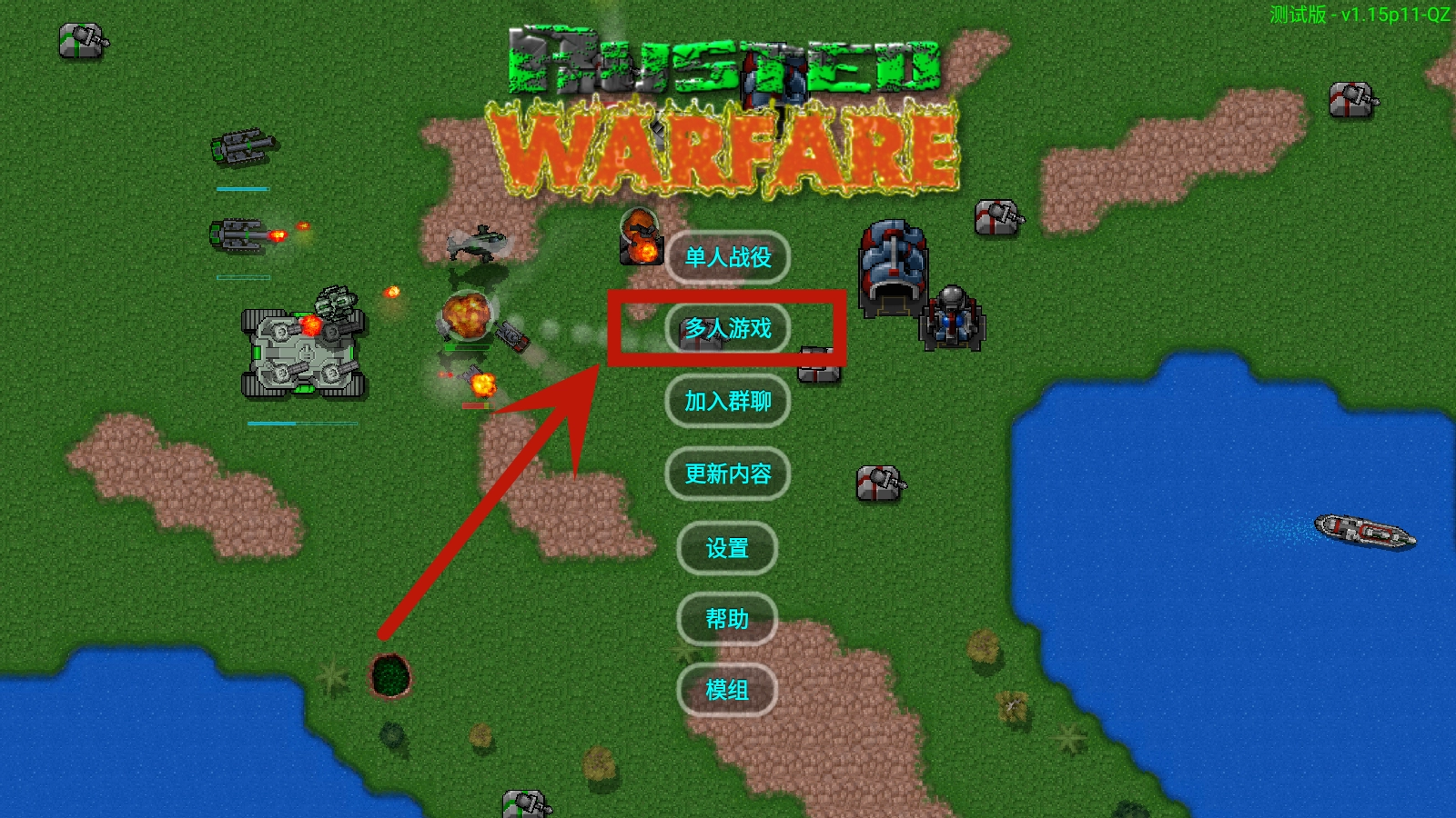 1、好铁锈战争,打开游戏后,点击【多人游戏】。