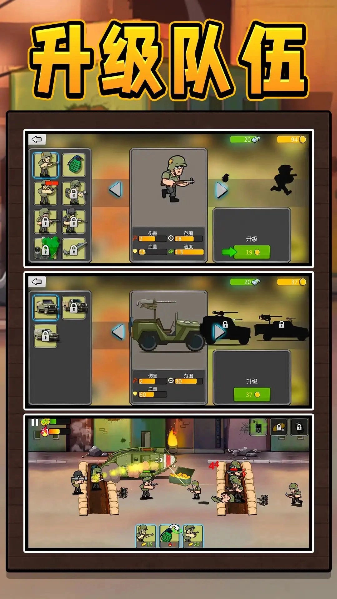 3、在每一次挑战过程中我们都可以智能规划并升级你的团队,在不同的难度的关卡中通过团队升级来应对敌人。
