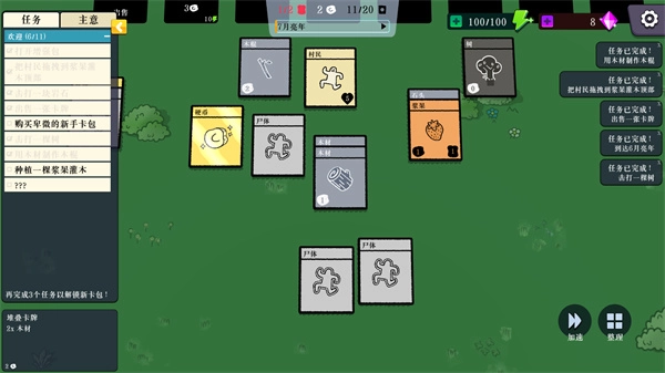 2. 在此过程中,你能够获取众多卡牌,像村民、木材、岩石之类。