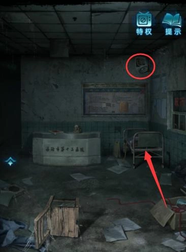 2、点击拖动病床,点击上方的喇叭,可以看到断掉的电线,使用【胶布】修复。