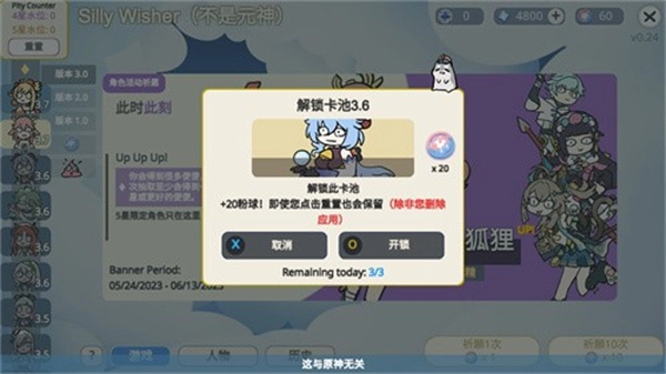 不是《元神》,而是一款基于人气极高的二次元开放世界冒险游戏《原神》改编而来的抽卡模拟器游戏。这款游戏的核心玩法就俩字:抽卡。玩家在这儿能获得大量抽卡机会,可以尽情抽取自己心仪的角色或装备,借此检验自己究竟是欧皇还是非酋。在这款游戏里,会依据游戏版本的奖池进行更新,并且其画风相当魔性,有种“大聪明”的既视感。