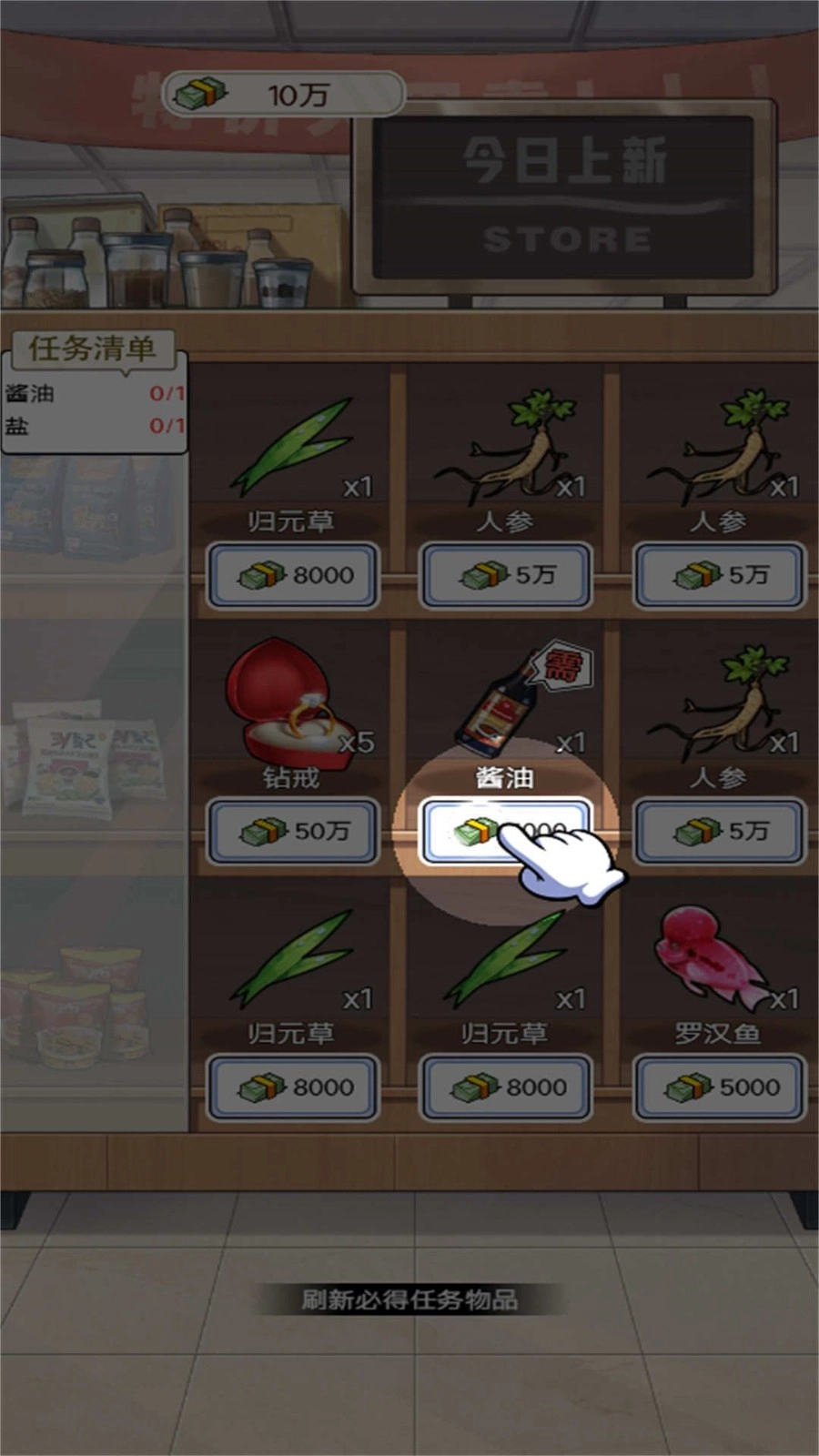 2、依据任务清单,去获取酱油、人参等各类物品完成任务。