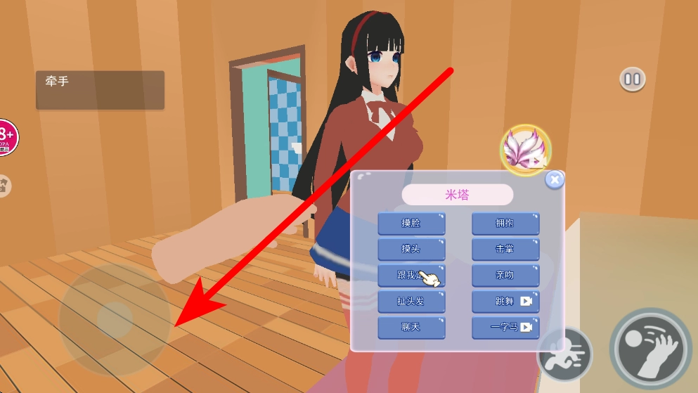 4、最后进行亲密互动,在互动界面,有摸脸、拥抱等多种亲密互动选项,选择相应的选项,即可与米塔进行亲密互动,增进与她的关系。