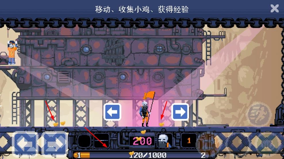 2、通过左右方向键操控角色移动,在场景中收集小鸡,积累经验,为后续挑战奠定基础。