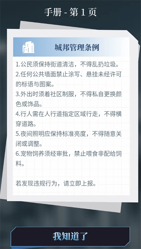1. 玩家饰演“审查员”,于名为“城邦”的理性社会里任职,其职责在于遵循规则,探寻并剔除人类行为中的“Bug”。