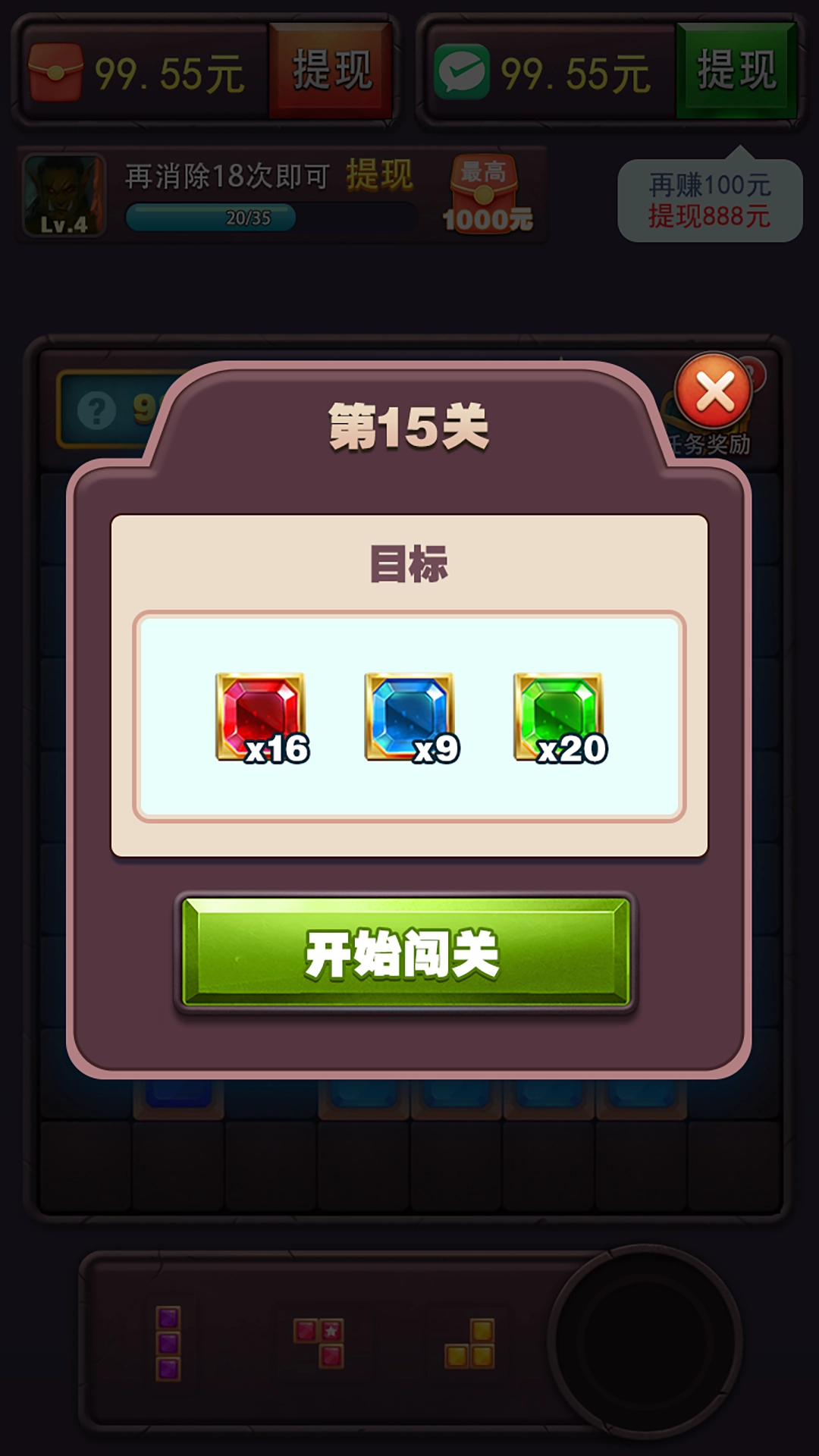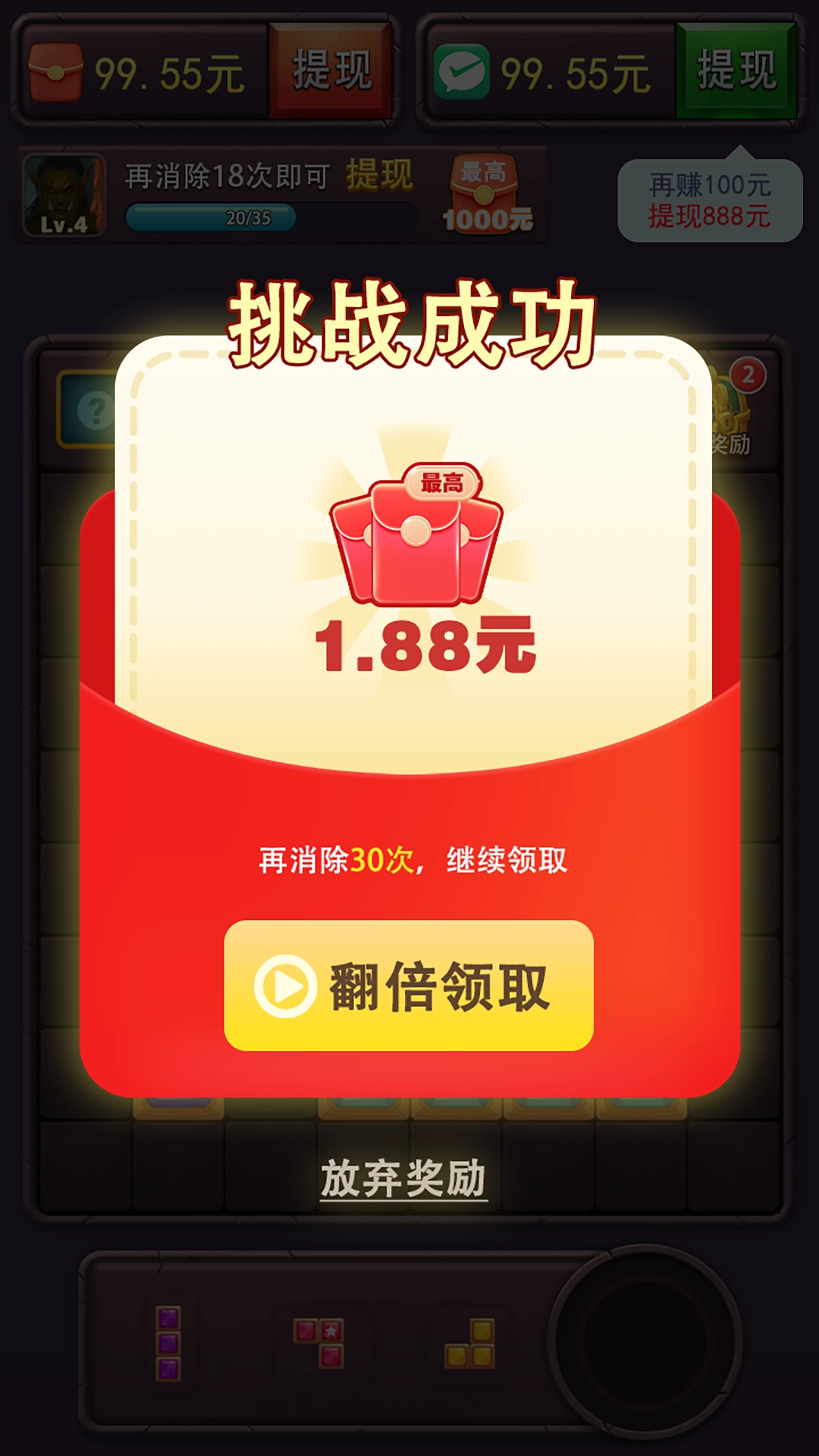 3. 丰富的奖励机制:《方块乐翻天》中设置了丰富的奖励机制,玩家可以通过连击、连消和完成挑战任务来获得丰厚的奖励。这些奖励可以激发玩家的积极性,让他们更有动力地挑战更高难度的关卡。