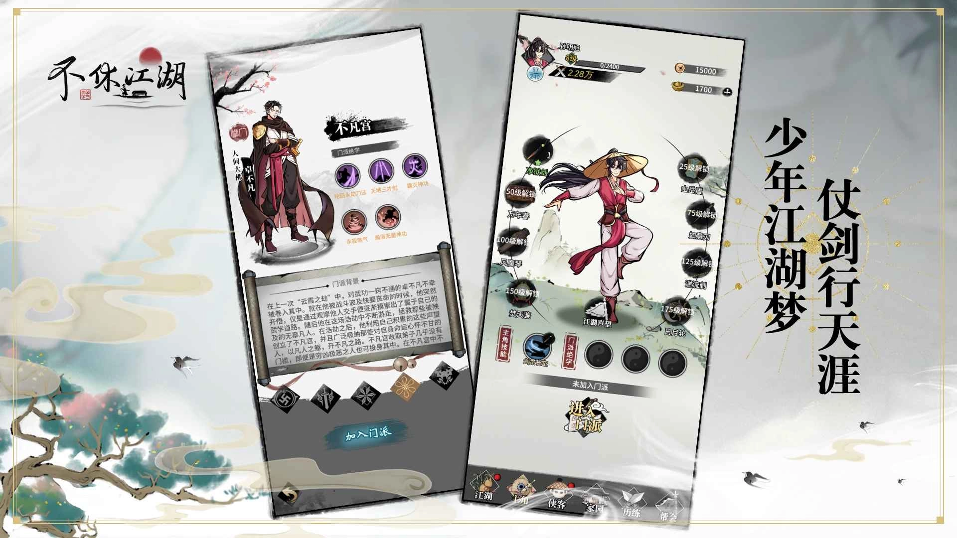 《不休江湖》,一款独具江湖韵味的挂机游戏,风格轻松惬意,简直是摸鱼神器。游戏内,武功秘籍千奇百怪,赋予玩家极高的自由度,玩法更是新颖独特。在这里,你既能与各路豪杰携手同游天地,除暴安良,伸张正义;也能寻觅红颜知己,相伴共赏名山大川,感受“只羡鸳鸯不羡仙”的浪漫。不仅如此,你还可以挽弓射雕,一展豪情壮志,成就一代天骄的传奇;亦或化身痴情种,令无数女侠为你倾心,误了终生。